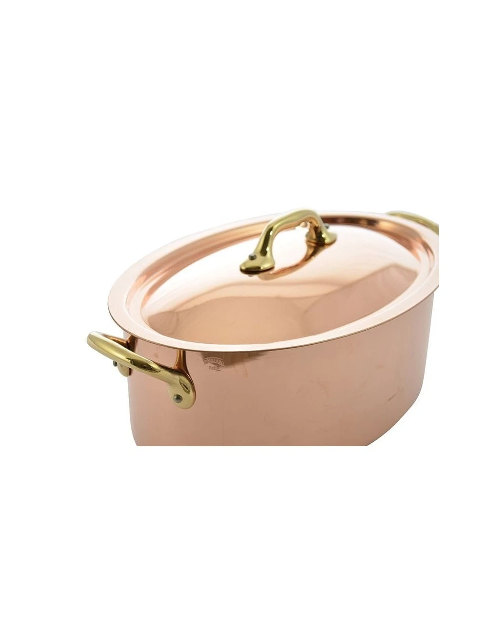 Cocotte ovale avec couvercle pour le service table. En cuivre avec un intérieur en acier inoxydable et monture bronze. Tous les avantages du cuivre, sans les contraintes d’utilisation et d’entretien, grâce à la feuille d’inox.