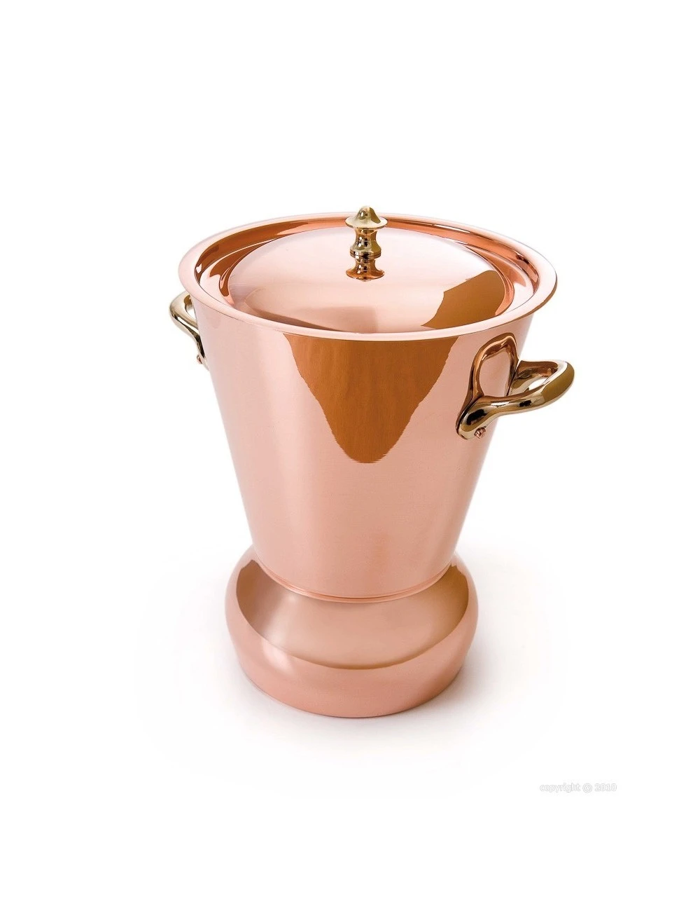 Marmite cuivre étamé, monture bronze, couvercle. Un bel objet pour réussir la cuisson des pommes vapeur ou les servir à table. Le cuivre et l’étain forment un couple très homogène et permettent une parfaite conduction de la chaleur. Attention toutefois : l’étain peut se détériorer à sec dès 230 °C. Diamètre 16 cm.
