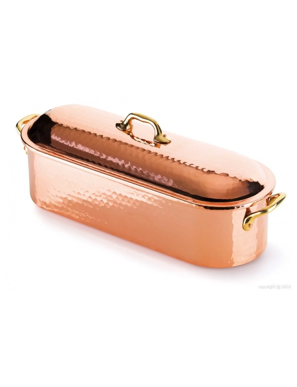 Plat cuivre étamé extrafort, monture bronze, couvercle. Idéal pour la cuisson des poissons entiers au court-bouillon et le service à table grâce à la qualité de sa présentation. Le service est facilité par la grille intérieure permet de sortir facilement le poisson sans l’abîmer. Longueur 40 cm.